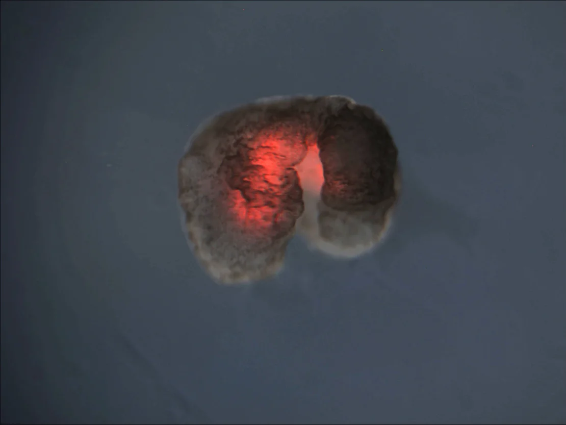 Pictured: A xenobot with large hind limbs and smaller forelimbs, layered with red heart muscle. Credit: Douglas Blackiston, Sam Kriegman