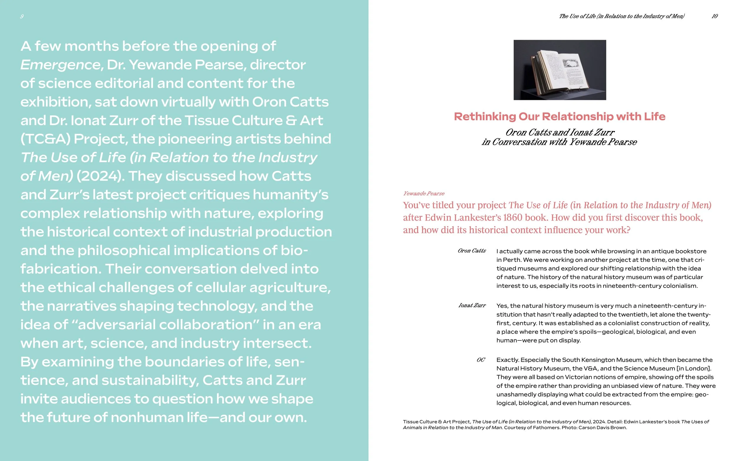 Emergence assembled artists, scientists, and artist-scientists working at the forefront of synthetic biology and contemporary art. Documentation of their projects as well as relevant writings and interviews, planning sketches, and other contextualizing materials are assembled in this catalog. Some contributors draw from their work in medical and transdisciplinary research laboratories, where they confront new categories of life that destabilize our understandings of sentience, hybridity, and artificiality. Others engage the tools of synthetic biology as materials for creative experimentation and studio-based inquiry. Many contributors argue for decolonizing science and expanding access to biotechnologies through DIY and community science initiatives. Across Emergence, audiences and participants are invited to contemplate our human capacities for creation, destruction, recklessness, renewal, and hope. The exhibition prompts us to ask: Who has agency in this moment of making, learning, and living with? What forms of life are we choosing to cultivate? What will we nurture, and what might we leave behind?